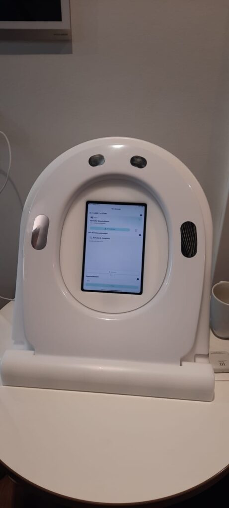 So wurde uns beispielsweise der Vorteil einer Treppensteigehilfe (solange das Training möglich ist) gegenüber einem Treppenlift verdeutlicht. Es gibt höhenverstellbare Toiletten mit Bidet und – tatsächlich – Fönfunktion. Auch Waschbecken lassen sich je nach Größe des Benutzers in der Höhe verstellen. Die Elektronik hält überall Einzug, so gibt es App-gesteuerte Inkontinenzeinlagen, die einen Nässealarm auslösen, und – hier haben wir am meisten gestaunt – einen Toilettensitz, der innerhalb einer Minute ein medizinisch anerkanntes EGK erstellen kann.
